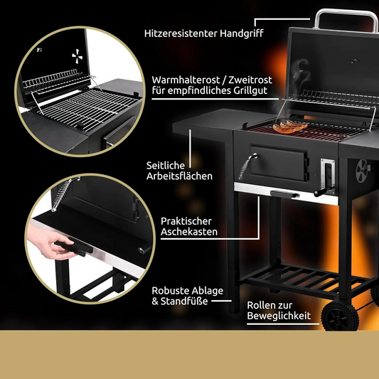 Luxus Holzkohle Grillwagen für 5-10 Personen – Höhenverstellbar mit Thermometer und 2 Rädern