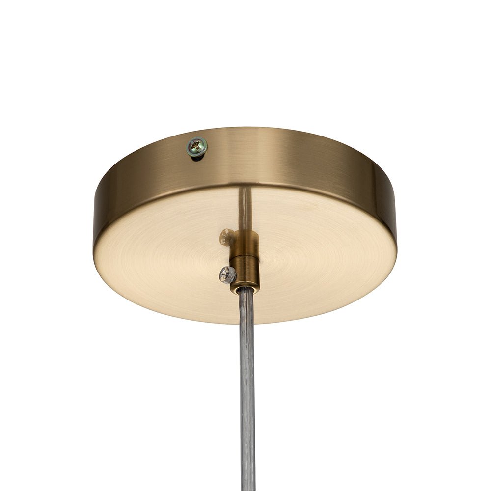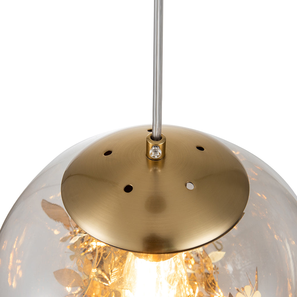 Erhellen Sie Ihr Zuhause mit der FloraGlobe-Pendelleuchte, einer kunstvoll gestalteten Glasball-Pendelleuchte, die modernen Minimalismus mit natürlichen Akzenten verbindet. Der klare, mundgeblasene Glasschirm ist mit filigranen, verzweigten Blättern verziert, die ein faszinierendes Lichtspiel erzeugen und eine warme, natürliche Atmosphäre schaffen. Die robuste Messing-Basis verleiht der Leuchte einen luxuriösen Vintage-Charakter und sorgt für einen edlen, industriellen Touch. Ideal für Esszimmer, Kücheninseln oder Wohnzimmer, setzt diese Pendelleuchte stilvolle Akzente und taucht jeden Raum in ein Ambiente zeitloser Schönheit. (Glühbirne nicht enthalten)