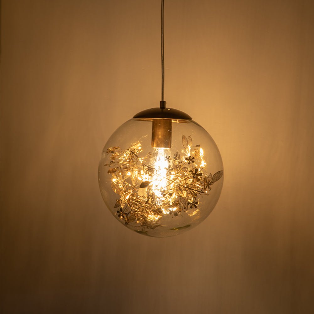 FloraGlobe – Elegante Glasball-Pendelleuchte mit verzweigten Blättern und Messing-Basis